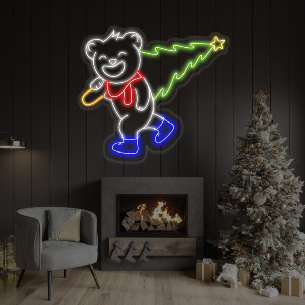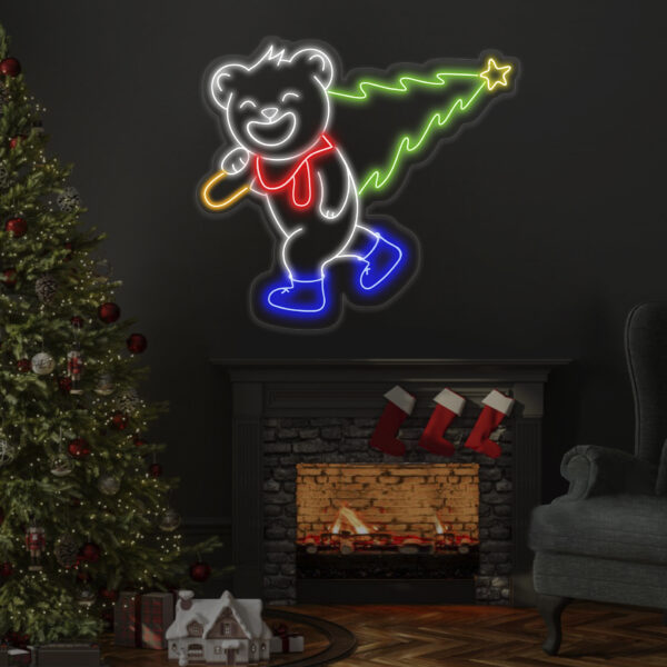 Smiling Bear Carrying A Christmas Tree Neon Sign, Bear Christmas Led Sign, Merry Christmas Neon Light, Christmas Tree Wall Art, Wall Decor